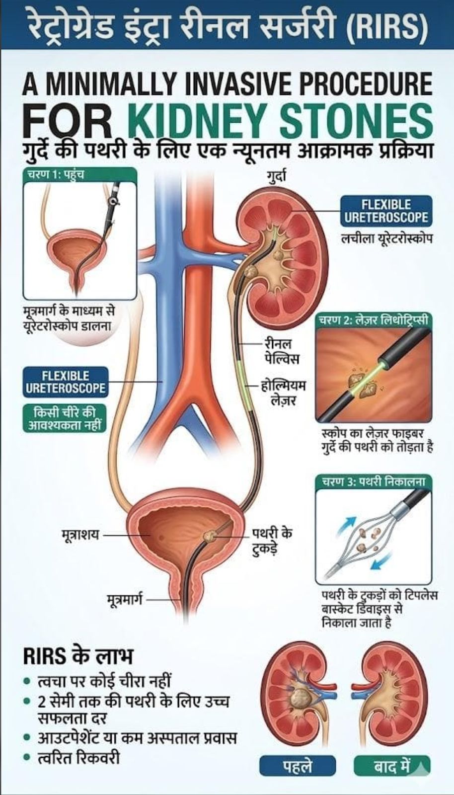 Advanced kidney stone treatment using Thulium Fiber Laser (TFL) and minimally invasive RIRS (Retrograde Intrarenal Surgery) techniques for precise stone removal with faster recovery and minimal pain.
